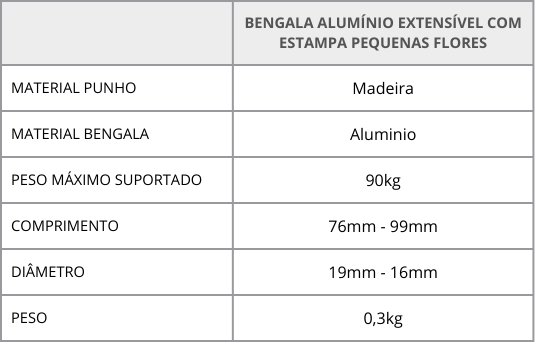 A bengala extensível de alumínio é uma ajuda prática e elegante para a mobilidade diária. Fabricada em alumínio leve com estampa de pequenas flores, possui punho de madeira ergonômico e ponteira de borracha para maior estabilidade.